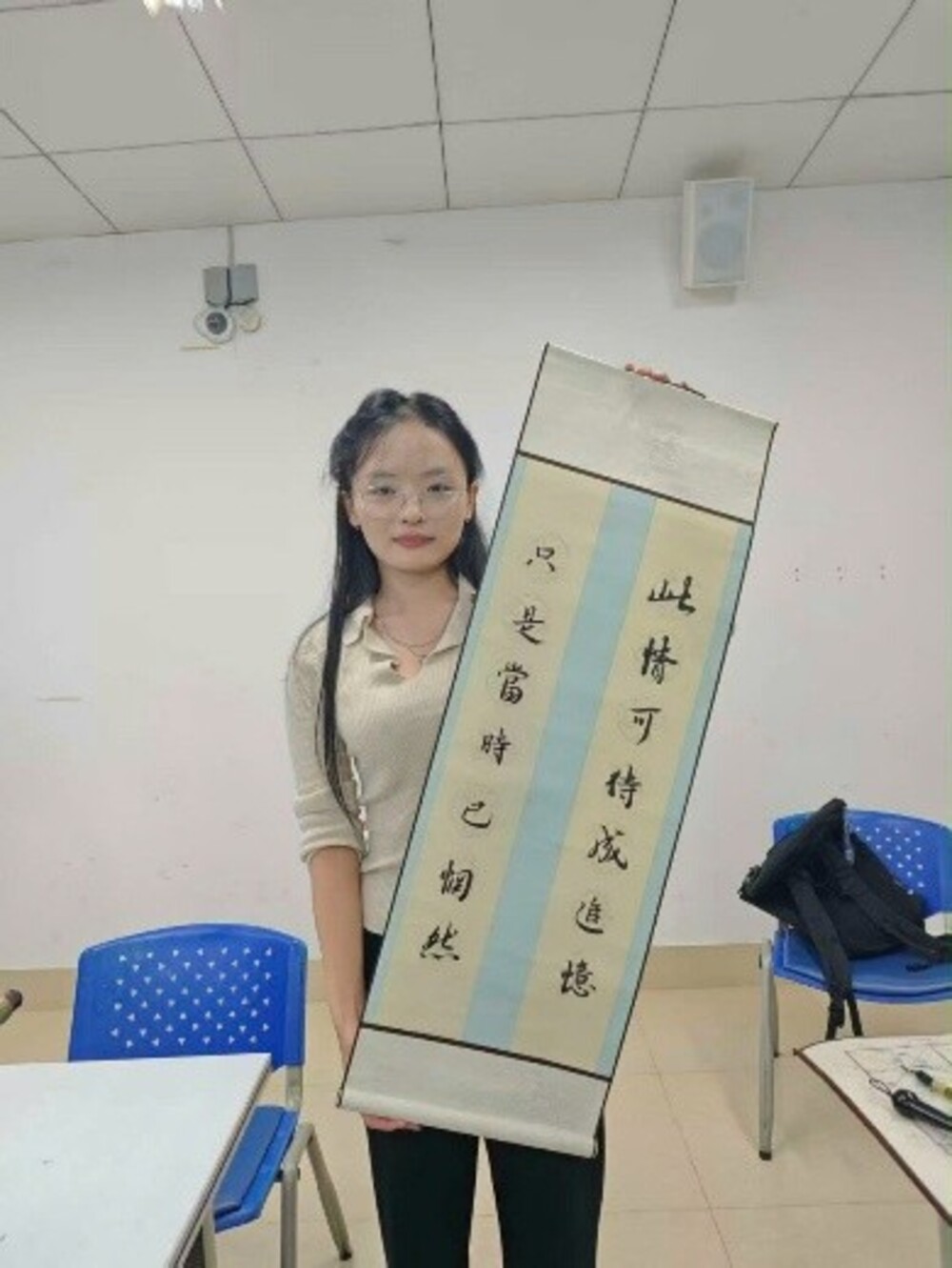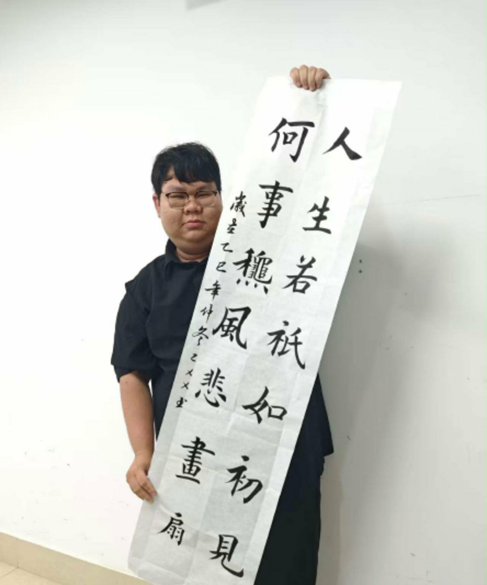 Sinh viên Lý Hồng Kiên cùng tác phẩm thư pháp đạt thành tích Giải Đặc biệt