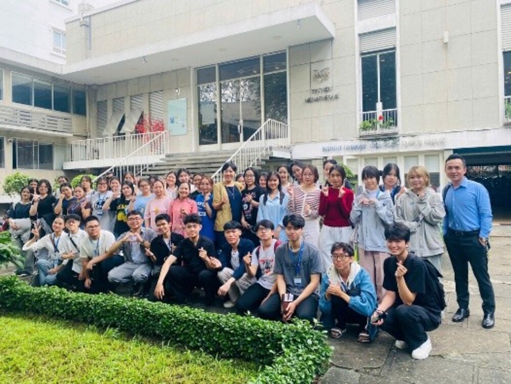 ThS. Đỗ Thị Bích Thuỷ và tập thể sinh viên Khoa Ngoại ngữ, Đại học Văn Hiến chụp hình lưu niệm cùng cán bộ Viện Trao đổi Văn hóa với Pháp (IDECAF)